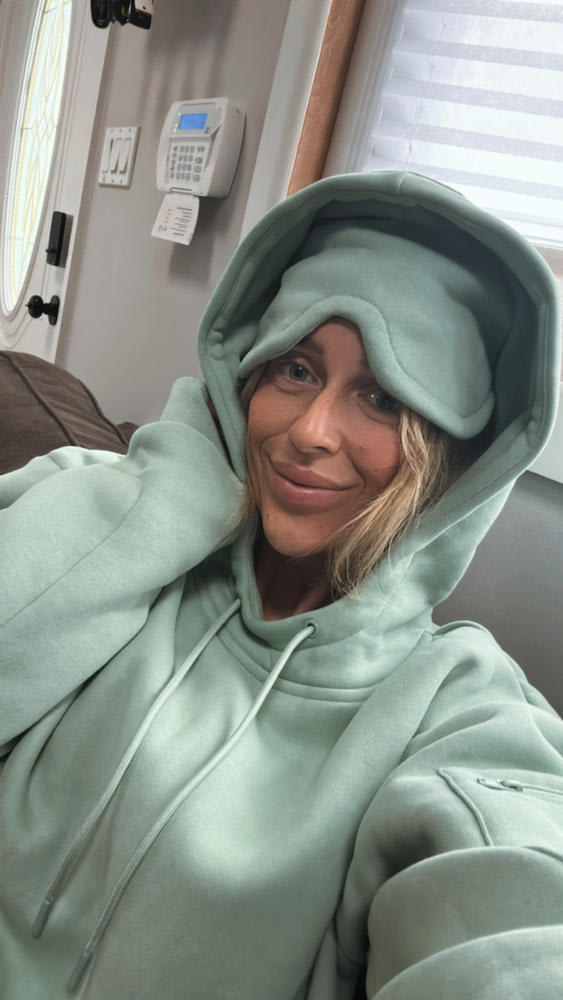 En un geste, votre capuche se transforme en masque de sommeil. Dans l’avion, le train ou même au bureau, vous pouvez enfin vous reposer sans lumière ni regards.